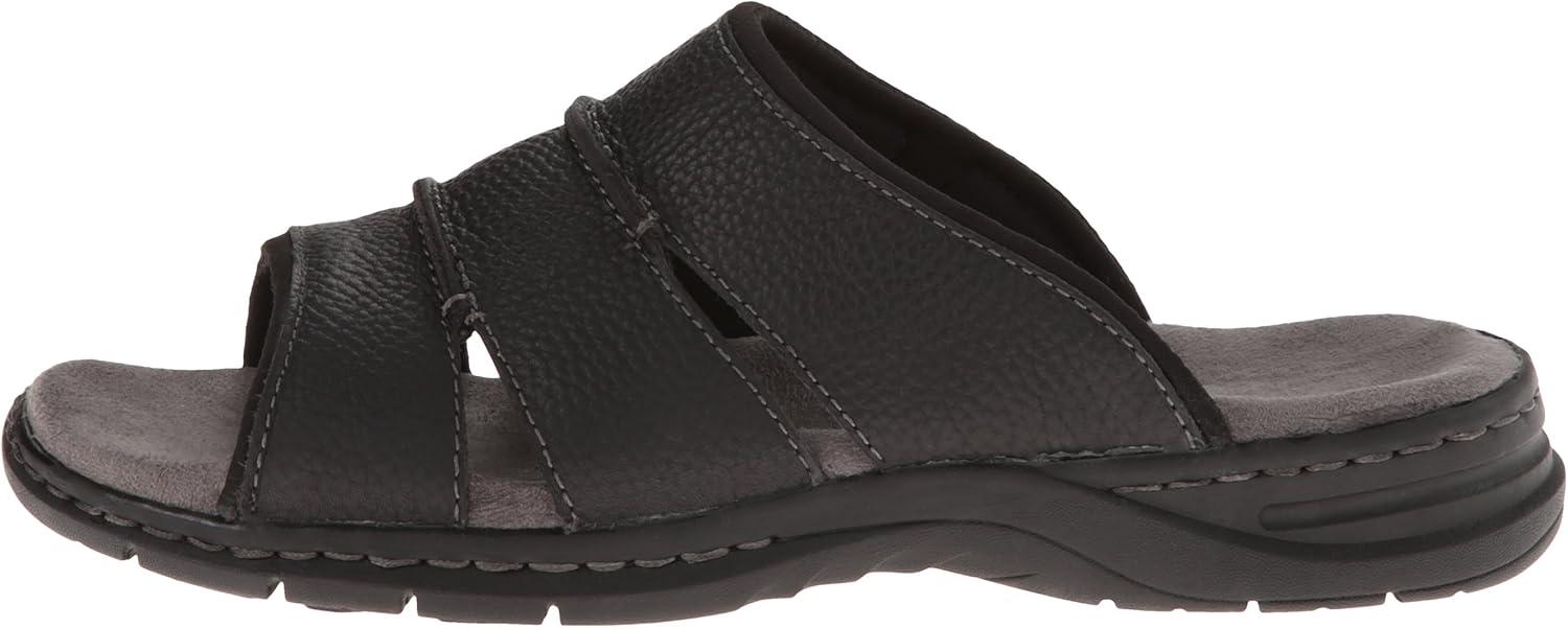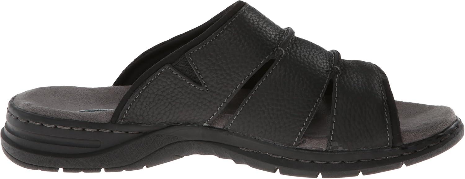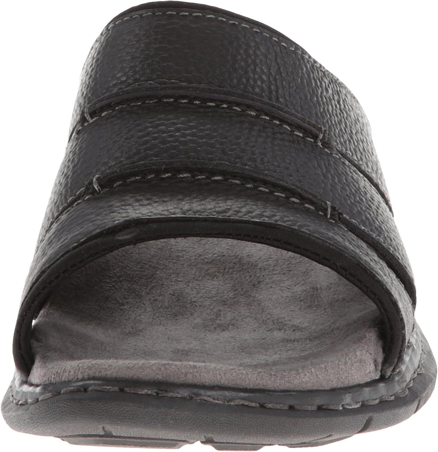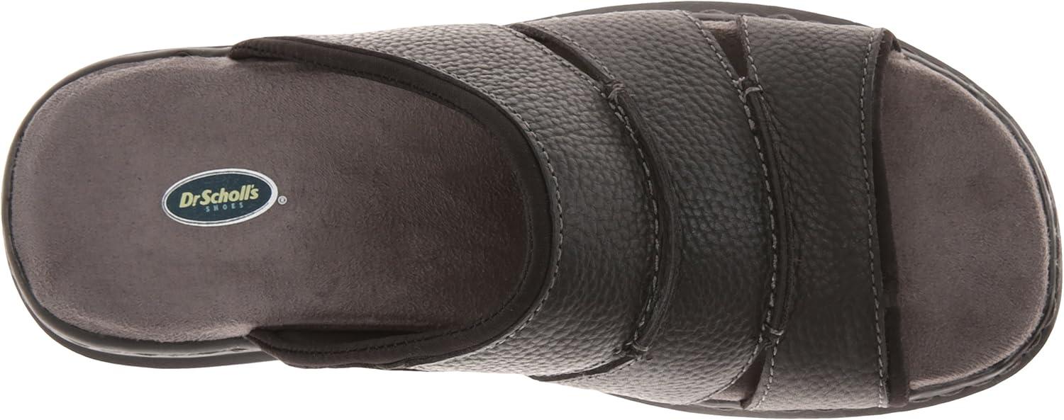 Mens casual slide into ultimate warm weather style with the Gordon sandals from Dr. Scholl's®. Majority leather upper in a casual mens slide sandal style with a round, open toe. Contrast stitching detail. Neoprene lining. Memory Fit® Foam insole. Traction outsole, 1 and 1/4 inch heel
