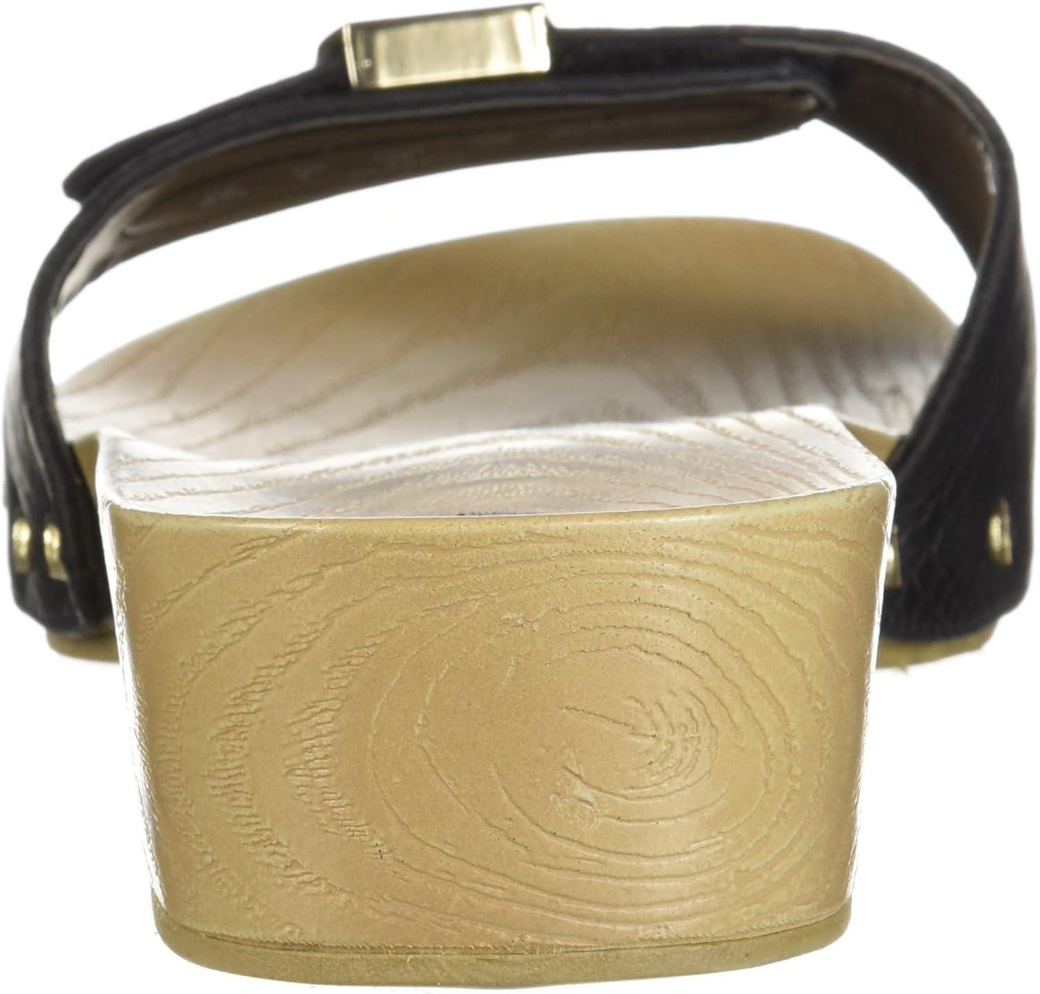 An inspired classic version of the Dr. Scholls Original Wood Sandal constructed with a simple rubber-bottom slide sandal and packed with comfort & style. MATERIALS: Faux leather. FIT: Slip on fit with signature square buckle for easy on/off. FEELS: Comfort Insole Technology with anatomical cushioning, comfort & support. MOVEMENT: Lightweight, flexible construction moves with you. STYLE: Metallic buckle detail, side nailhead accents, and woodgrain-printed PU outsole with 1 and 1/2 inch heel. With a nod to vintage styling, this classic slide works for every style personality.