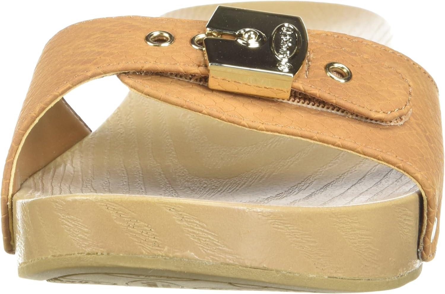An inspired classic version of the Dr. Scholls Original Wood Sandal constructed with a simple rubber-bottom slide sandal and packed with comfort & style. MATERIALS: Faux leather. FIT: Slip on fit with signature square buckle for easy on/off. FEELS: Comfort Insole Technology with anatomical cushioning, comfort & support. MOVEMENT: Lightweight, flexible construction moves with you. STYLE: Metallic buckle detail, side nailhead accents, and woodgrain-printed PU outsole with 1 and 1/2 inch heel. With a nod to vintage styling, this classic slide works for every style personality.