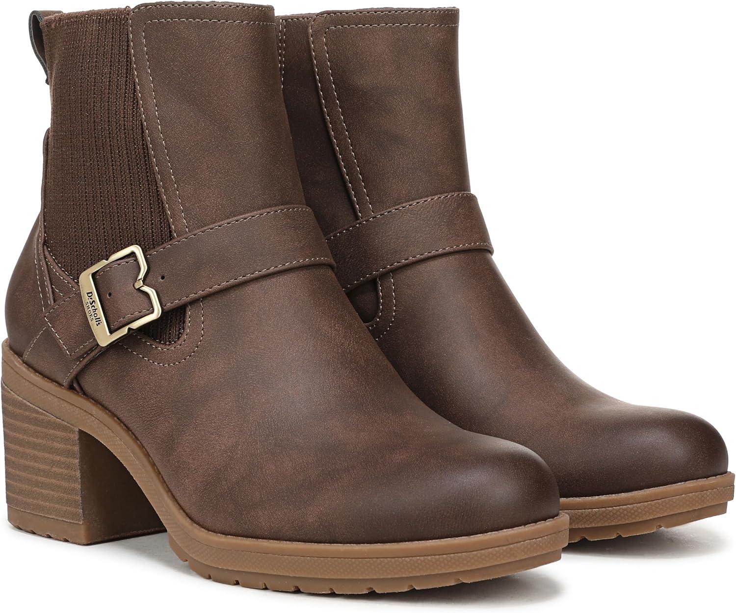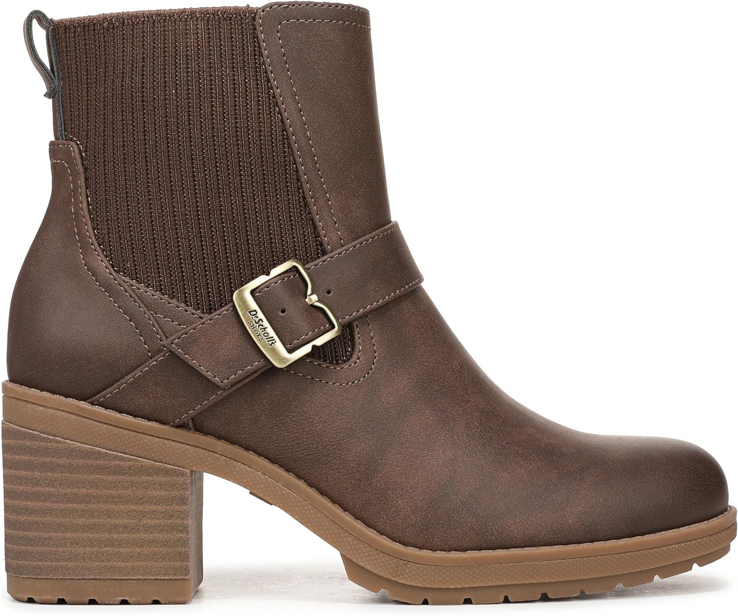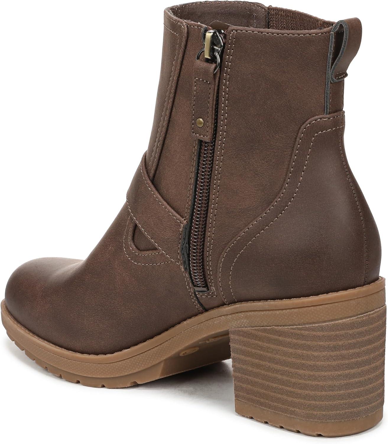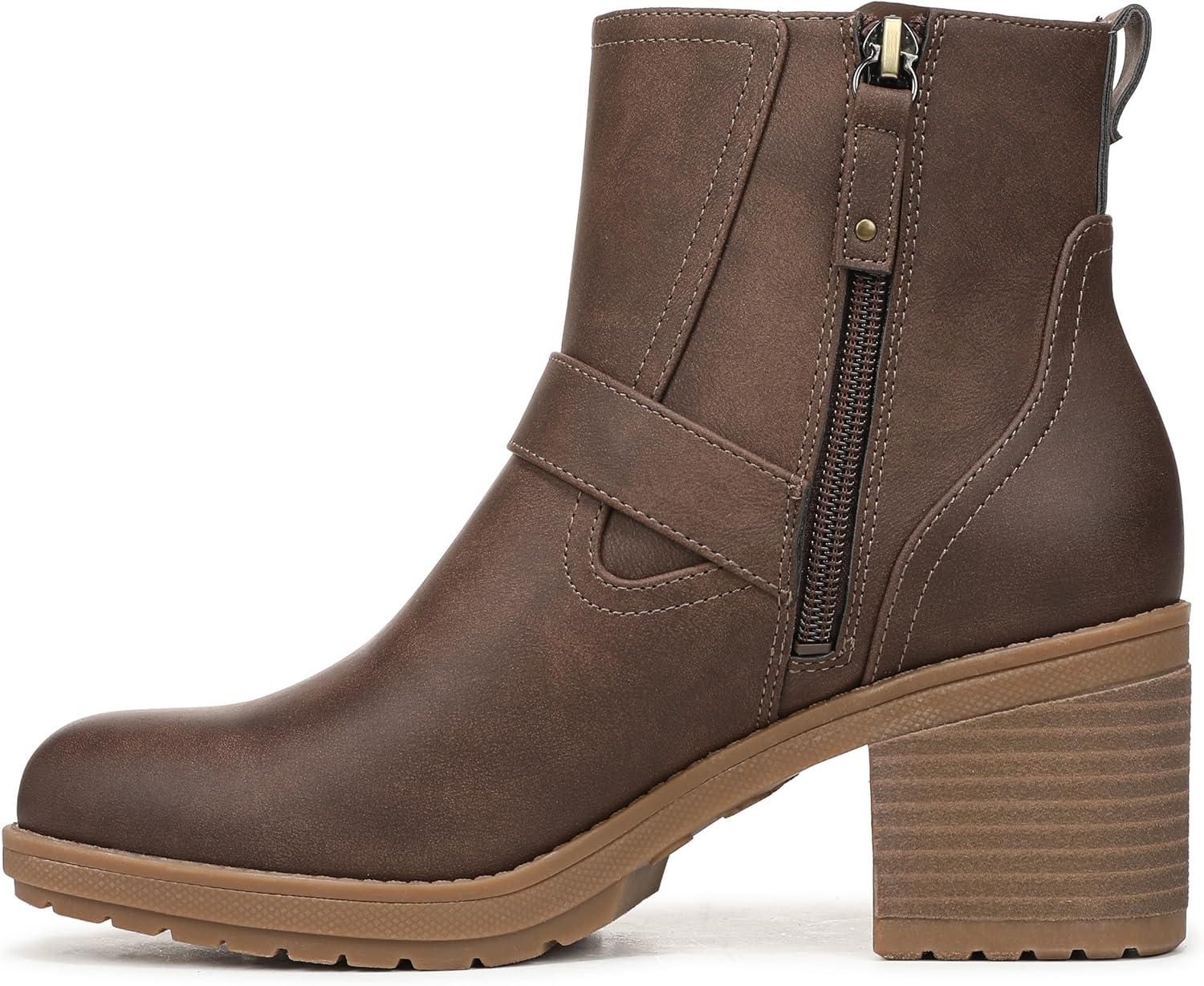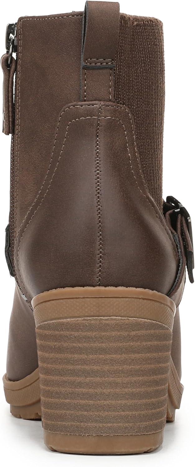 Lug sole Chelsea boots for women with elevated comfort. SUSTAINABLY CRAFTED: Fabric lining and topcloth partially made from recycled plastic bottles. MATERIALS: Low chemical faux leather fabric upper. FIT: Outside stretch gore and inside zip closure for easy on/off. SUSTAINABLE COMFORT: Anti-microbial, anti-odor Insole Technology with cushioning, comfort, & support. Insoles partially crafted with 15% cushy, algae-infused BLOOM® foam. MOVEMENT: Lightweight, flexible construction moves with you. STYLE: Womens ankle boots with round toe, Chelsea-inspired stretch gore, strap with iconic buckle detail, back pull tab, and 2 3/4 inch stacked heel with TPR lug sole. CONSCIOUSLY PACKAGED: This style is shipped in an environmentally preferred 1-piece box made with primarily recycled materials that can be recycled & soy-based inks. Fierce and forever original. These block heel moto boots feel just as cool as they look.