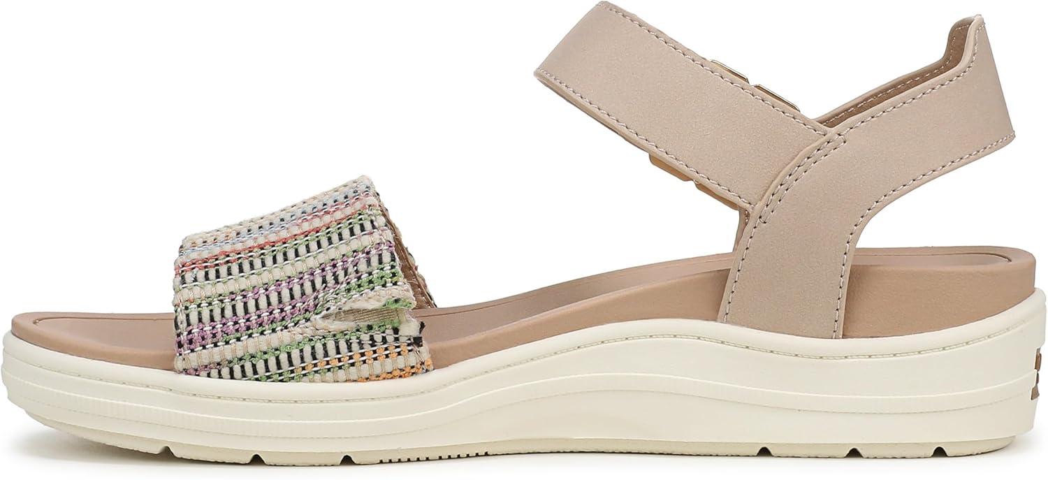Sport sandals for travel and everyday inspired by our viral Time Off sneaker. SUSTAINABLY CRAFTED: Low chemical faux leather lining. MATERIALS: Canvas fabric vamp with low chemical faux leather straps, low chemical faux leather upper, or metallic upper with molded EVA footbed and TPR outsole. FIT: Ankle strap with adjustable hook-and-loop closure for easy on/off. FEELS: Insole Technology with anatomical cushioning, comfort, & arch support. FEEL GOOD FLEX: Soft, lightweight outsole with built in flex grooves. MOVEMENT: Lightweight, flexible construction moves with you. STYLE: Quarter strap sandals for women our iconic buckle detail, sporty hybrid design, 1 2/3 wedge heel and grippy sport sole. CONSCIOUSLY PACKAGED: This style is shipped in an environmentally preferred 1-piece box made with primarily recycled materials that can be recycled & soy-based inks. Sky’s the limit in these womens sandals with sporty feels and all the comfort of the most-wanted Time Off travel sneakers.
