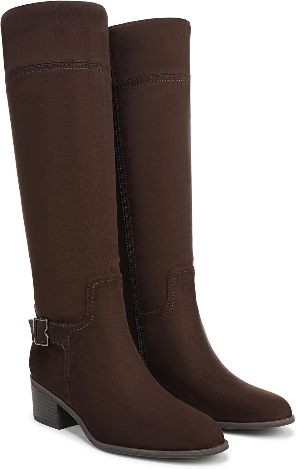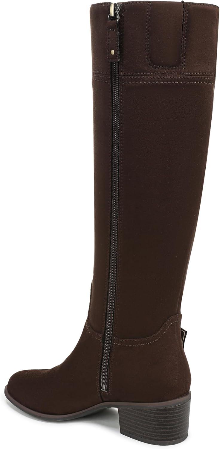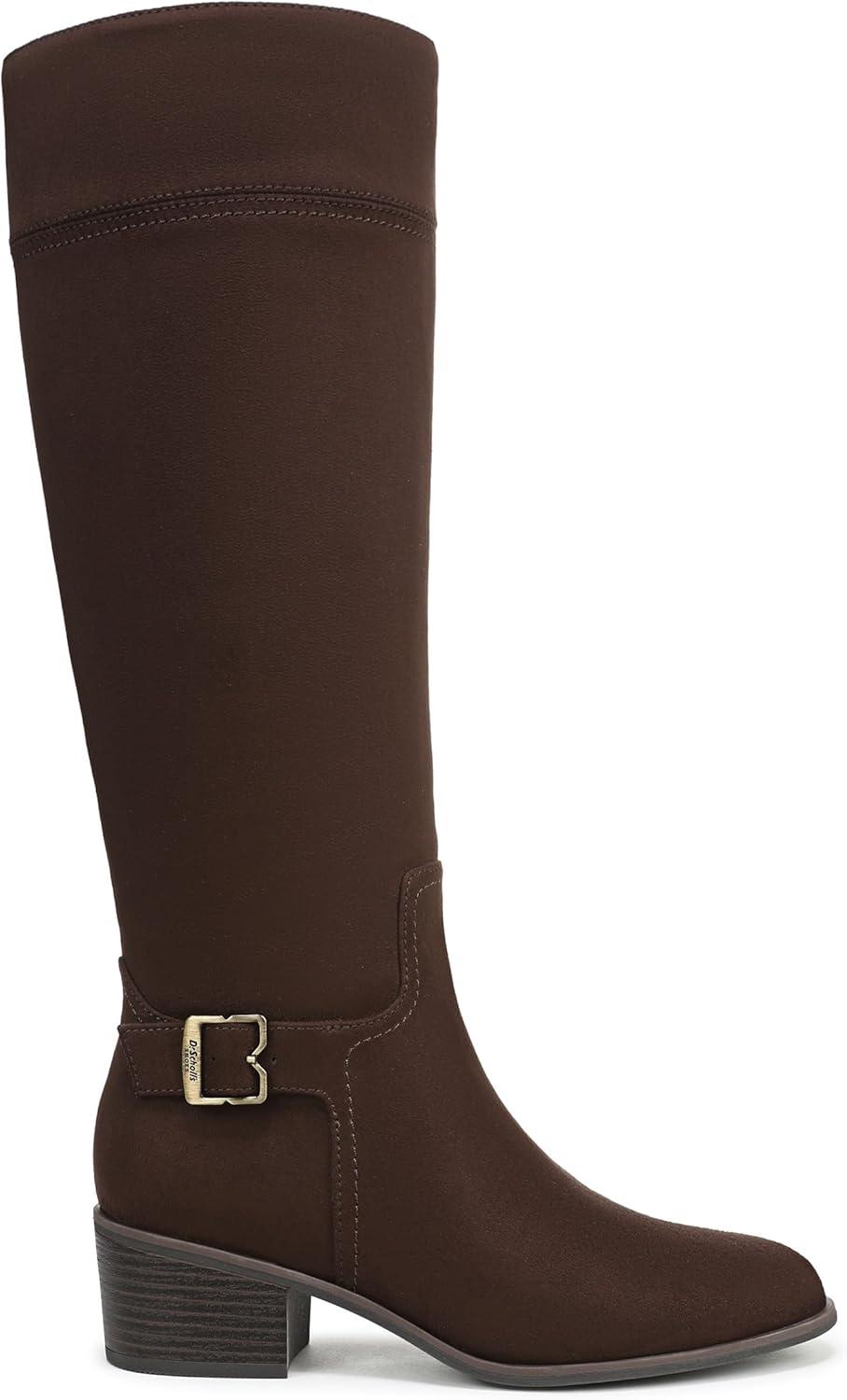 Riding boots for women designed with innovative comfort. SUSTAINABLY CRAFTED: Fabric linings and topcloth partially made from recycled plastic bottles; partially recycled toe box and heel counter. MATERIALS: Faux leather upper or microfiber upper partially made from recycled plastic bottles. FIT: Inside zipper for secure fit. FEELS: Anti-microbial, anti-odor Insole Technology with cushioning, comfort, & support. STYLE: Knee high boots with iconic buckle detailing, stitch accents, and 2 inch stacked heel and TPR outsole. CONSCIOUSLY PACKAGED: This style is shipped in an environmentally preferred 1-piece box made with primarily recycled materials that can be recycled & soy-based inks. With classic design and feel-good comfort, these tall shaft boots will elevate countless outfits.