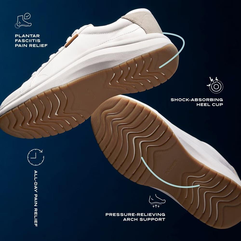 Podiatrist recommended plantar fasciitis shoes for women with built-in insole technology for all-day heel pain relief and modern sneaker style. PLANTAR FASCIITIS PAIN RELIEF: Scientifically engineered insole with Shock Guard® Technology and cushioning heel cup absorbs shock & reduces heel pressure. Clinically proven to relieve and prevent heel pain immediately and all day. Supportive arch reduces overstretching of your plantar fascia, allowing it to heal. SUSTAINABLY CRAFTED: Fabric lining partially made from recycled plastic bottles, fabric topcloth partially made from recycled materials, and partially recycled toe box and toe counter. MATERIALS: Leather upper responsibly sourced from Leather Working Group certified tanneries and EVA midsole. FIT: Lace up closure with stretch tie lacing for dynamic adjustability and secure fit. SUSTAINABLE COMFORT: Anti-microbial, anti-odor topcloth and 20% plant-based BLOOM® foam layer under the insole for cushioning, comfort, & arch support. MOVEMENT: Lightweight, flexible construction with flex grooves to move with you. STYLE: Womens tennis shoes with a padded collar, soft knit tongue for breathability, and stitch detailing, rubber outsole, and 1 1/2 inch sport sole. CONSCIOUSLY PACKAGED: This style is shipped in an environmentally preferred 1-piece box made with primarily recycled materials that can be recycled & soy-based inks. Mood: feeling good. These womens sneakers are the best shoes for plantar fasciitis that feel good AND look good.