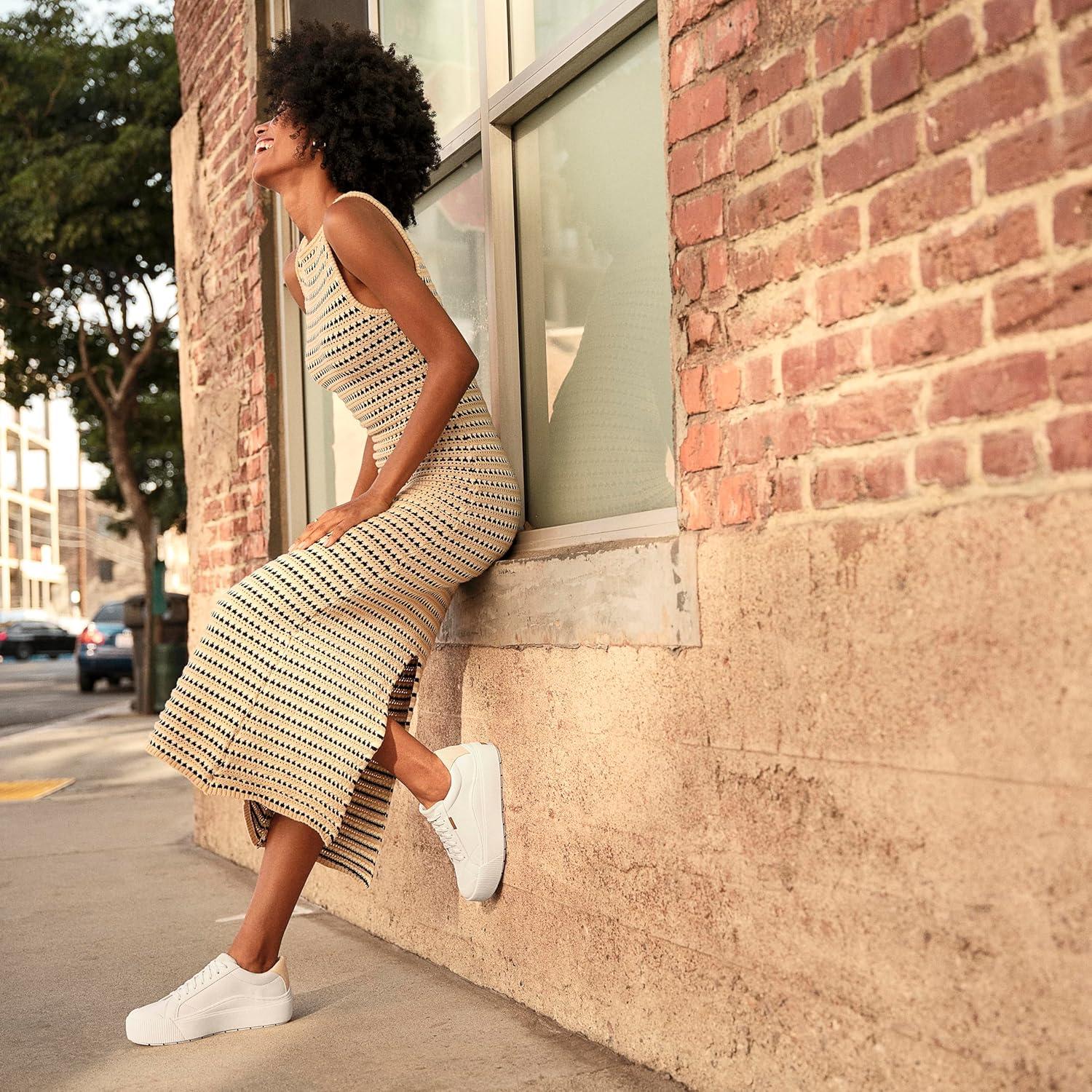 An elevated version of the viral womens platform sneakers. SUSTAINABLY CRAFTED: Fabric lining, footbed and topcloth partially made from recycled plastic bottles; partially recycled toe box and heel counter. MATERIALS: Faux leather, canvas, or fabric upper, or microfiber upper made from partially recycled plastic bottles. EASY CLEAN: Pre-treated with Easy Clean Repellant, a topical spray applied to the sidewall of the shoe only, to keep the sides of the shoe’s sole cleaner longer. Individual results may vary. FIT: Lace up front with padded heel for a secure fit. SUSTAINABLE COMFORT: Anti-microbial, anti-odor Insole Technology with cushioning, comfort, & arch support. Insoles partially crafted with 15% cushy, algae-infused BLOOM® foam. MOVEMENT: Lightweight, flexible construction moves with you. STYLE: Womens lace up tennis shoes with retro-inspired toe cap and 2 1/4 white platform sole. As seen (and loved) on TikTok: THE most comfortable walking shoes for travel. And everything else.