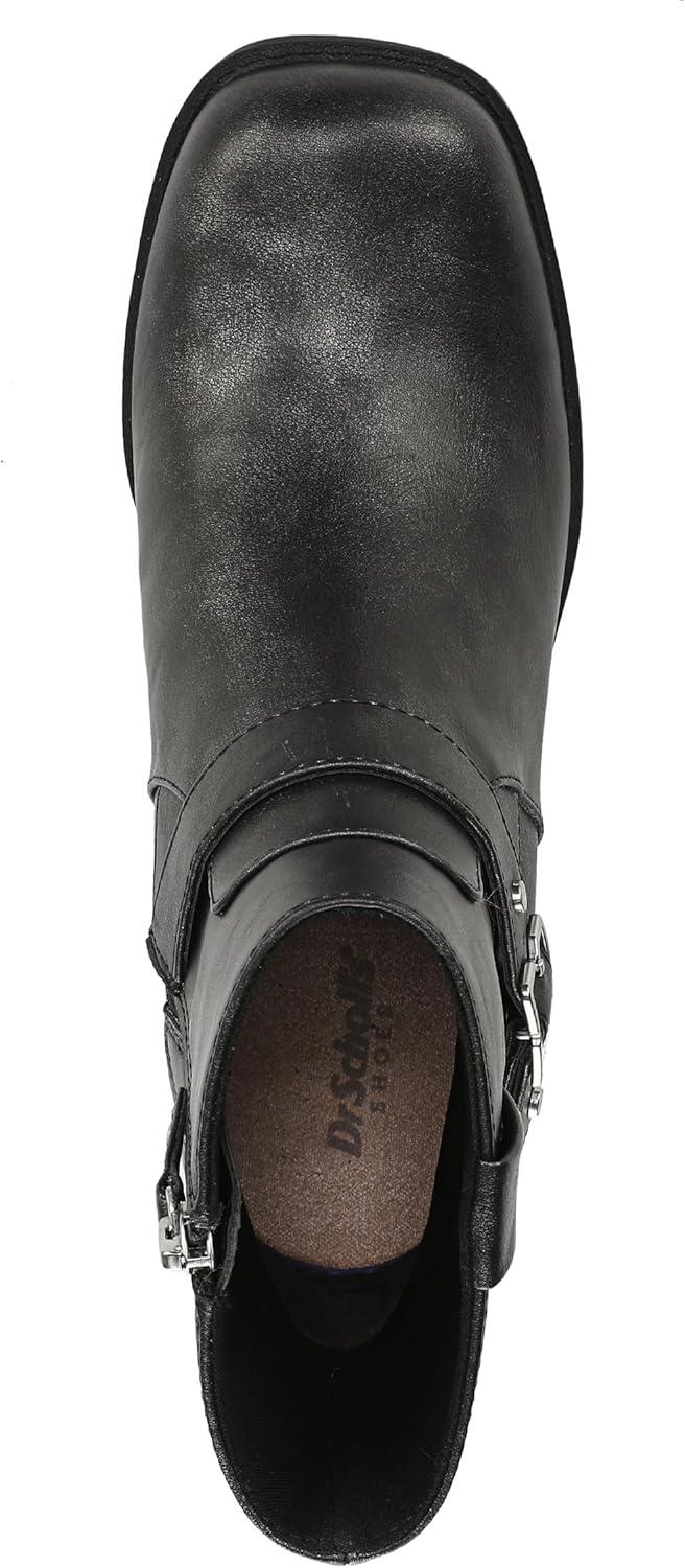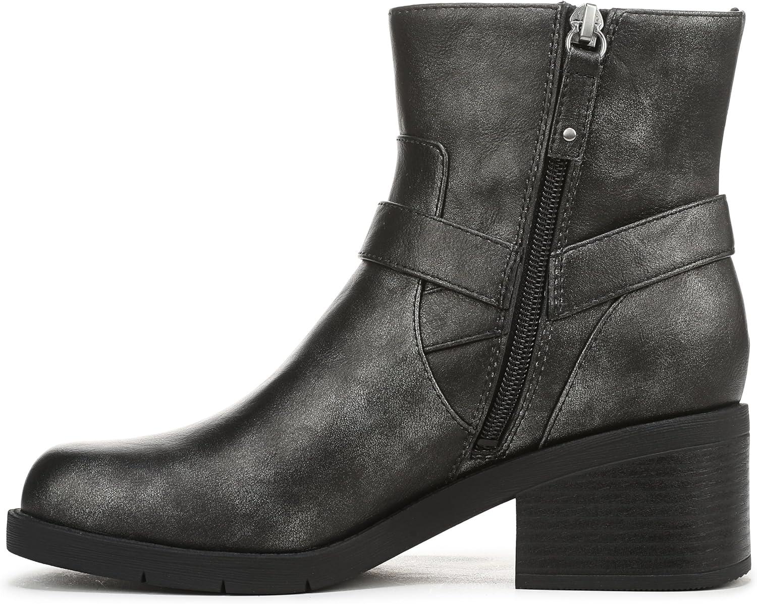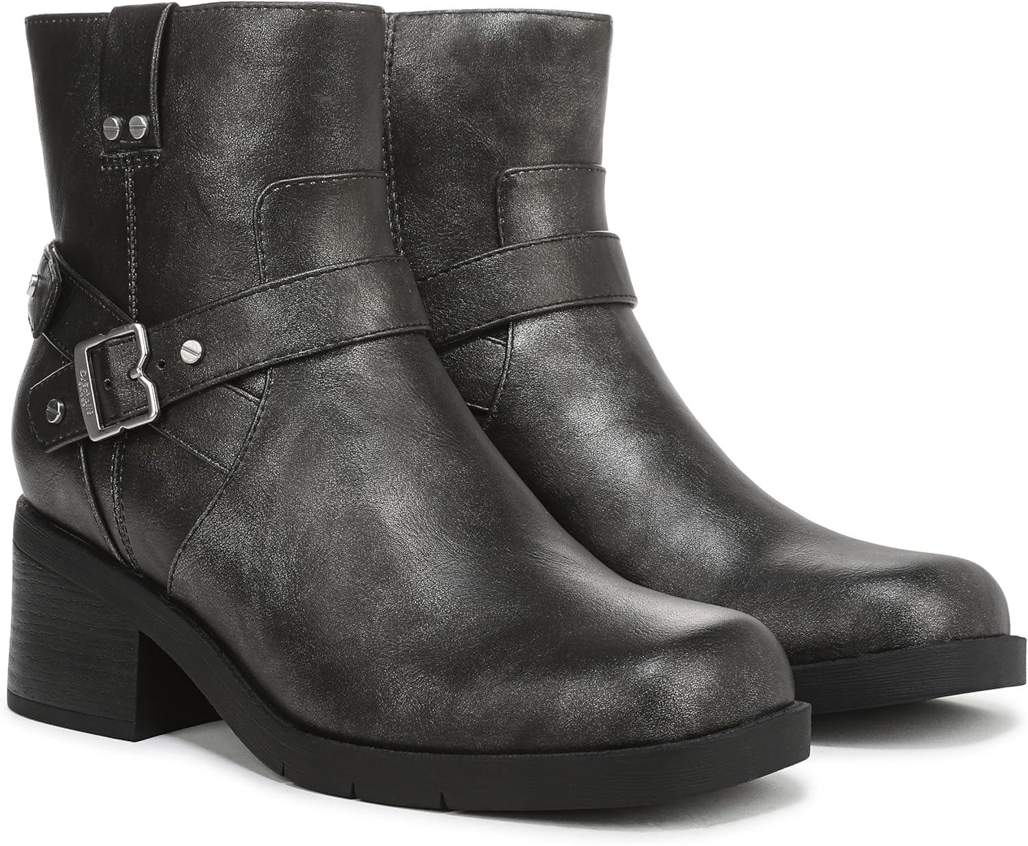 Moto boots for women infused with cool comfort. SUSTAINABLY CRAFTED: Linings and topcloth partially made from recycled plastic bottles; partially recycled toe box and heel counter. MATERIALS: Faux leather upper. FIT: Inside zipper for easy on/off. SUSTAINABLE COMFORT: Anti-microbial, anti-odor Insole Technology with cushioning, comfort, & support that uses 15% cushy plant-based BLOOM® foam insole. STYLE: Rugged women’s moto boots with strap details, iconic buckle accent, round toe, and 2 1/4 inch block heel with blown TPR outsole. CONSCIOUSLY PACKAGED: This style is shipped in an environmentally preferred 1-piece box made with primarily recycled materials that can be recycled & soy-based inks. Boots with buckles add instant edge, while our legendary comfort makes these your best walking shoes.